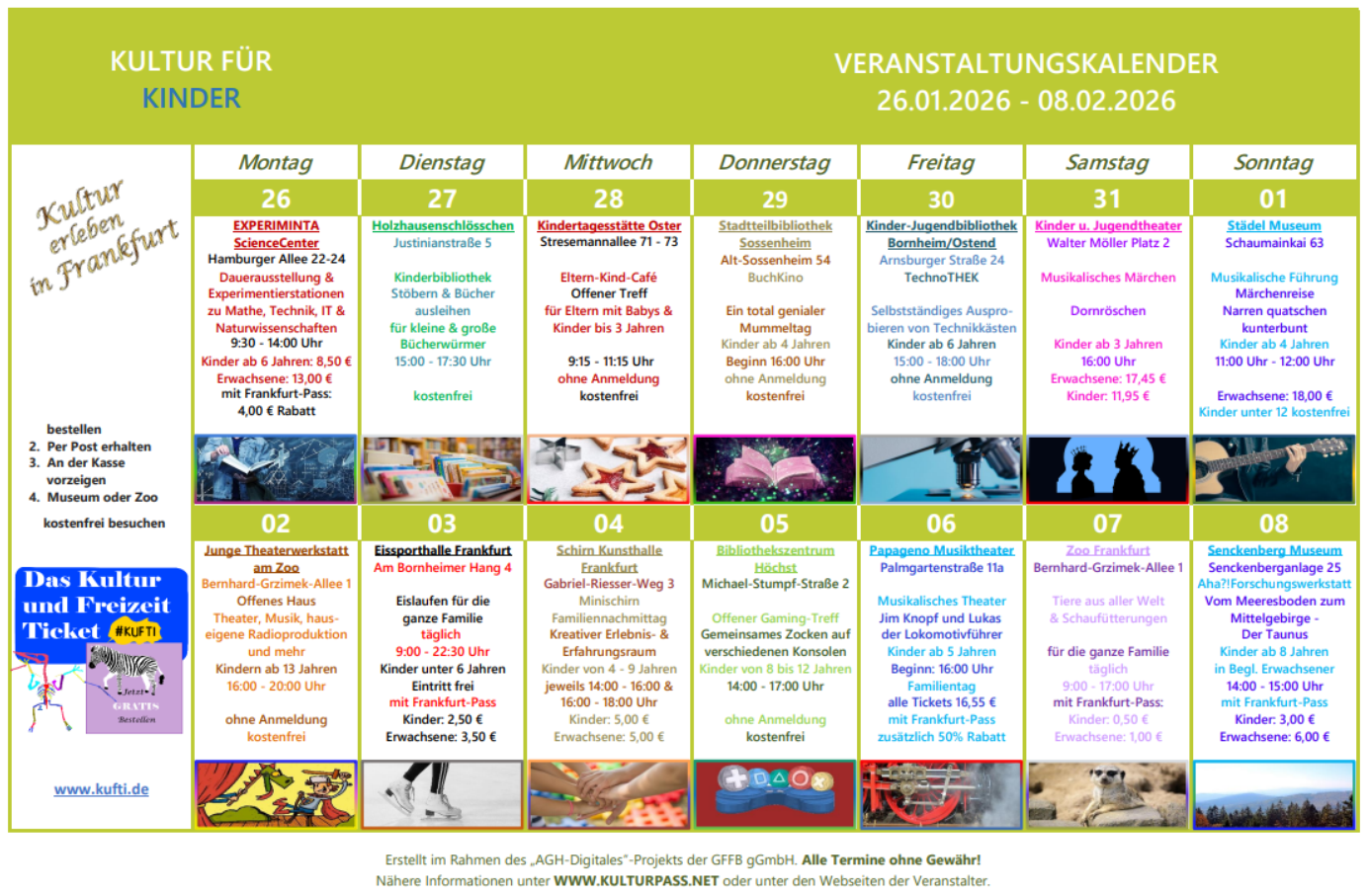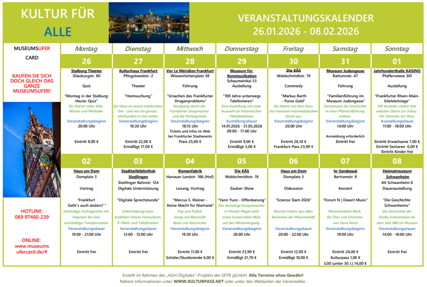 Einen kleineren Einblick zu Veranstaltungen in den nächsten 2 Wochen können wir Ihnen aber gerne bereits hier über unsere beiden Kulturkalender geben.