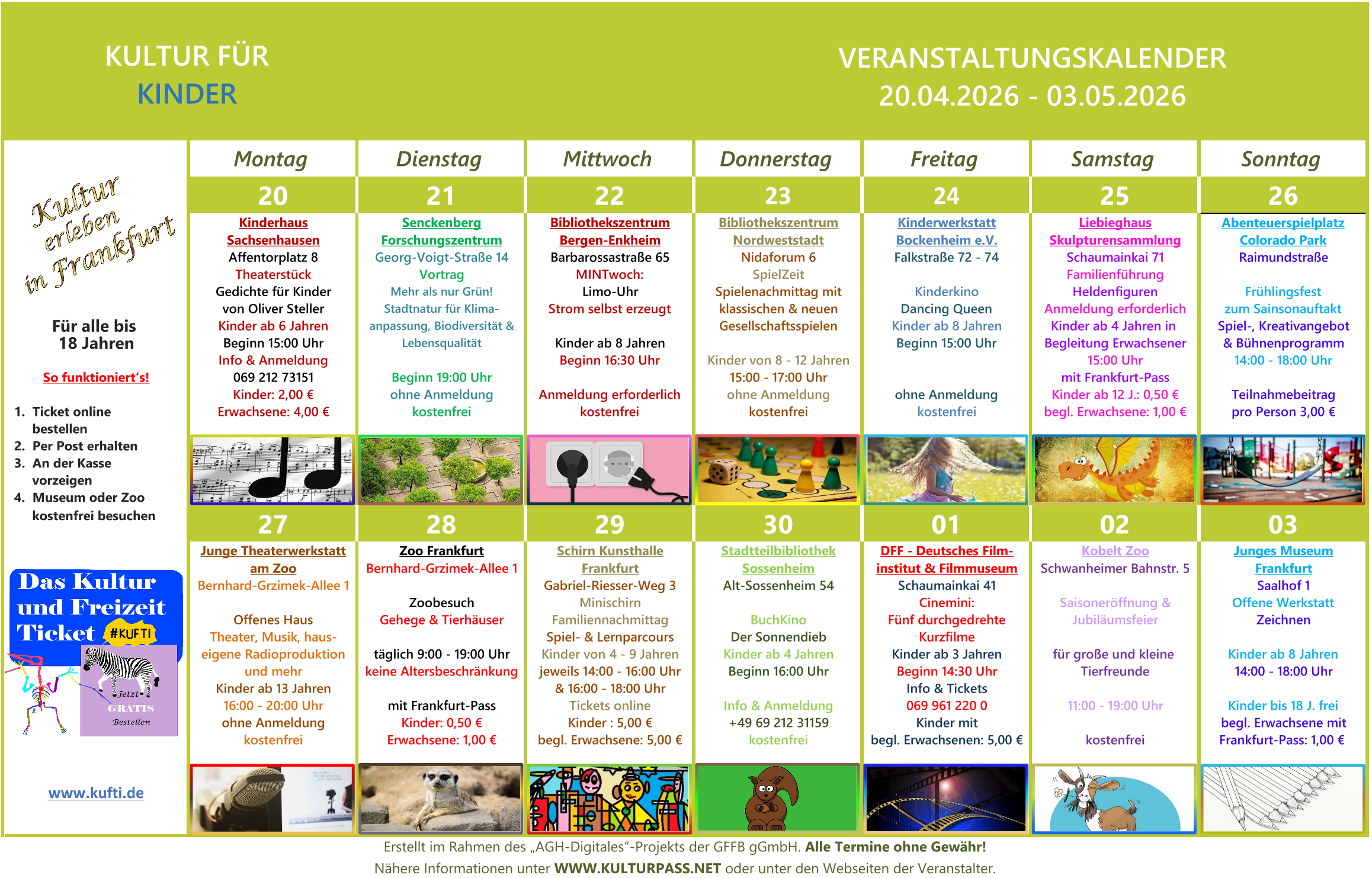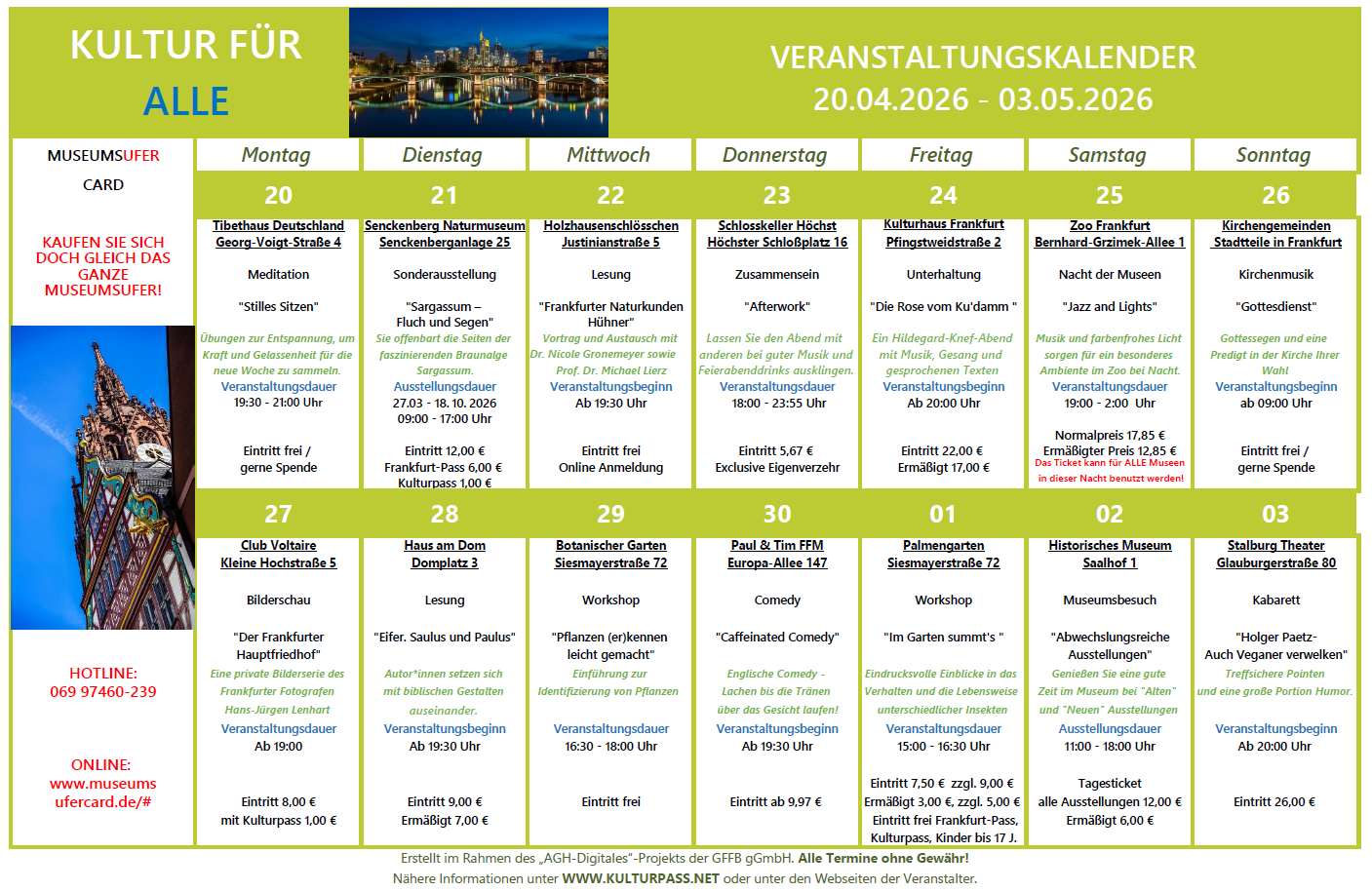 Einen kleineren Einblick zu Veranstaltungen in den nächsten 2 Wochen können wir Ihnen aber gerne bereits hier über unsere beiden Kulturkalender geben.